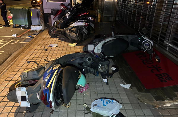 中壢警分局中壢交通指出,二十三日深夜十一時,警方接獲民眾報案電話,指稱在桃園市中壢區延平路台一線中壢國小對面一處醫院前發生車禍有多部機車被撞,還有附近大樓停靠在路邊的垃圾子母車被撞,馬路和車廊都散茖一堆機車零件。