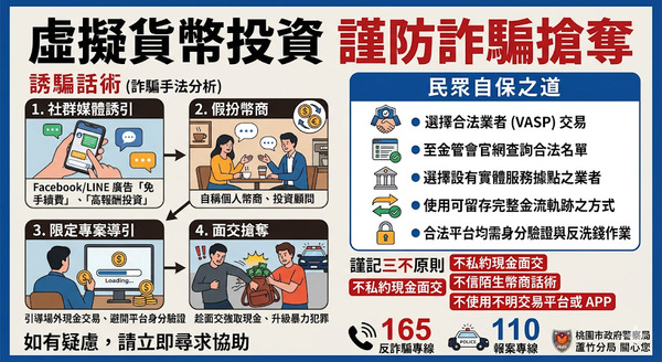 蘆竹警察分局鄭重呼籲,民眾如有虛擬貨幣投資或交易需求,務必選擇已完成洗錢防制法令遵循聲明之合法虛擬資產服務業者(VASP)進行交易,相關合法業者名單可至金融監督管理委員會官方網站查詢,切勿輕信來路不明之個人幣商或非正式平台。合法業者均設有實體服務據點,並以可留存完整金流軌跡之方式進行交易,絕不會要求民眾攜帶大量現金至非正式場所進行面交;民眾應牢記「三不原則」—不私約現金面交、不信陌生幣商話術、不使用來路不明之交易平台或APP。