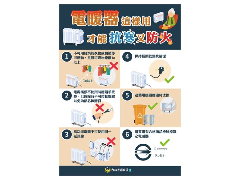 • 購買具合格商品檢驗標識之電暖器(如R字號、RoHS標章)。
