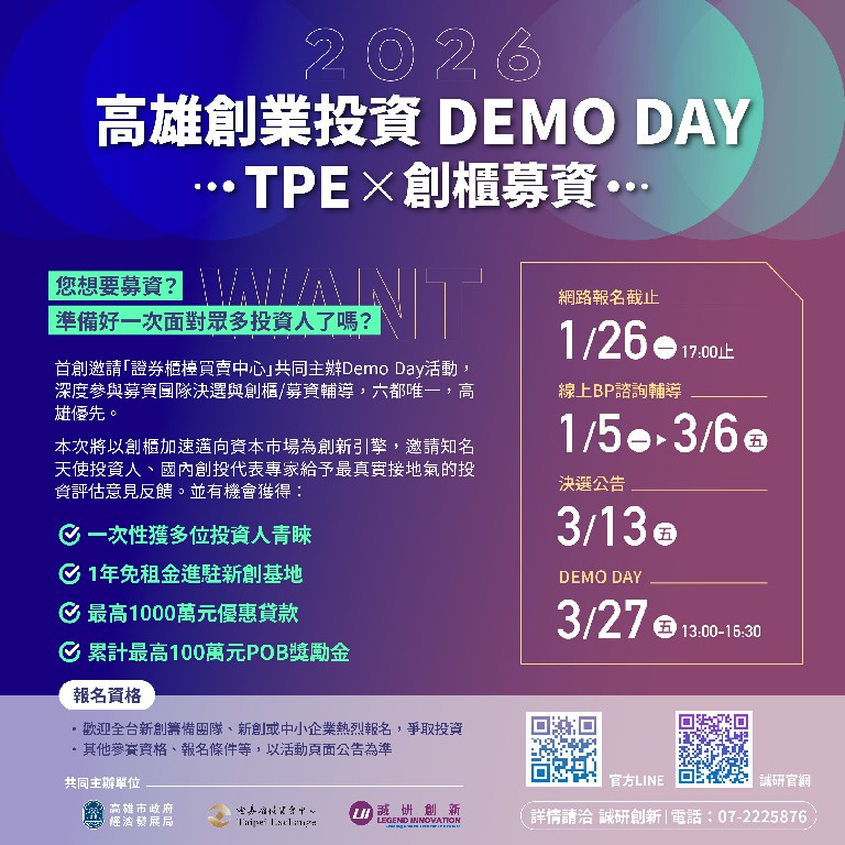 加速高雄潛力新創獲資本青睞!年度指標性全國創業活動「2026 高雄創業投資DEMO DAY | TPEx創櫃募資」第三屆開跑,協助創業團隊精準對接資本市場、取得關鍵資金與人脈、加速企業成長。2026年活動將全面升級,首度攜手證券櫃檯買賣中心(TPEx),導入完整的資本市場制度資源,整合創櫃板機制、投資實務與實戰型BP簡報訓練,協助企業站上資本舞台。報名時間自即日起至1月26日止,歡迎新創與中小企業踴躍報名。