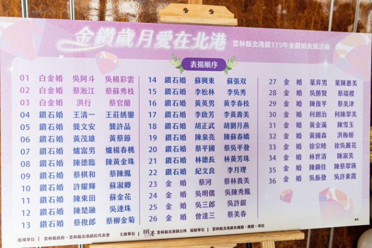 北港鎮公所舉辦金鑽婚表揚活動共表揚婚齡超過50年以上的36對賢伉儷,其中3對是婚齡70年以上白金婚、19對婚齡60年以上鑽石婚及14對婚齡50年以上金婚,每對夫妻都以長年相伴的歲月,寫下動人的愛情故事,也成為家庭與社會中最溫暖的典範。