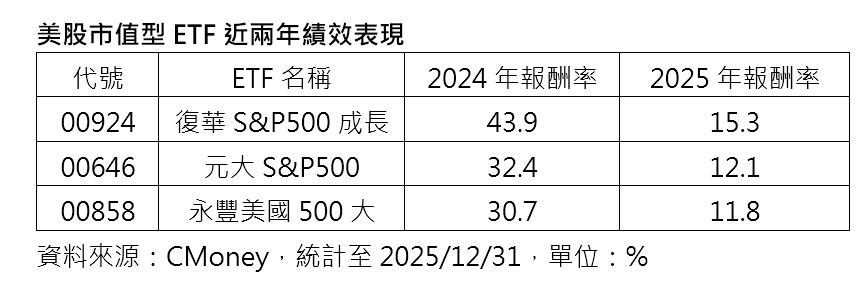 至於美股市值型ETF,以復華S&P500成長(00924)近年表現相對突出,2024與2025年連續兩年位居美股市值型ETF績效冠軍。