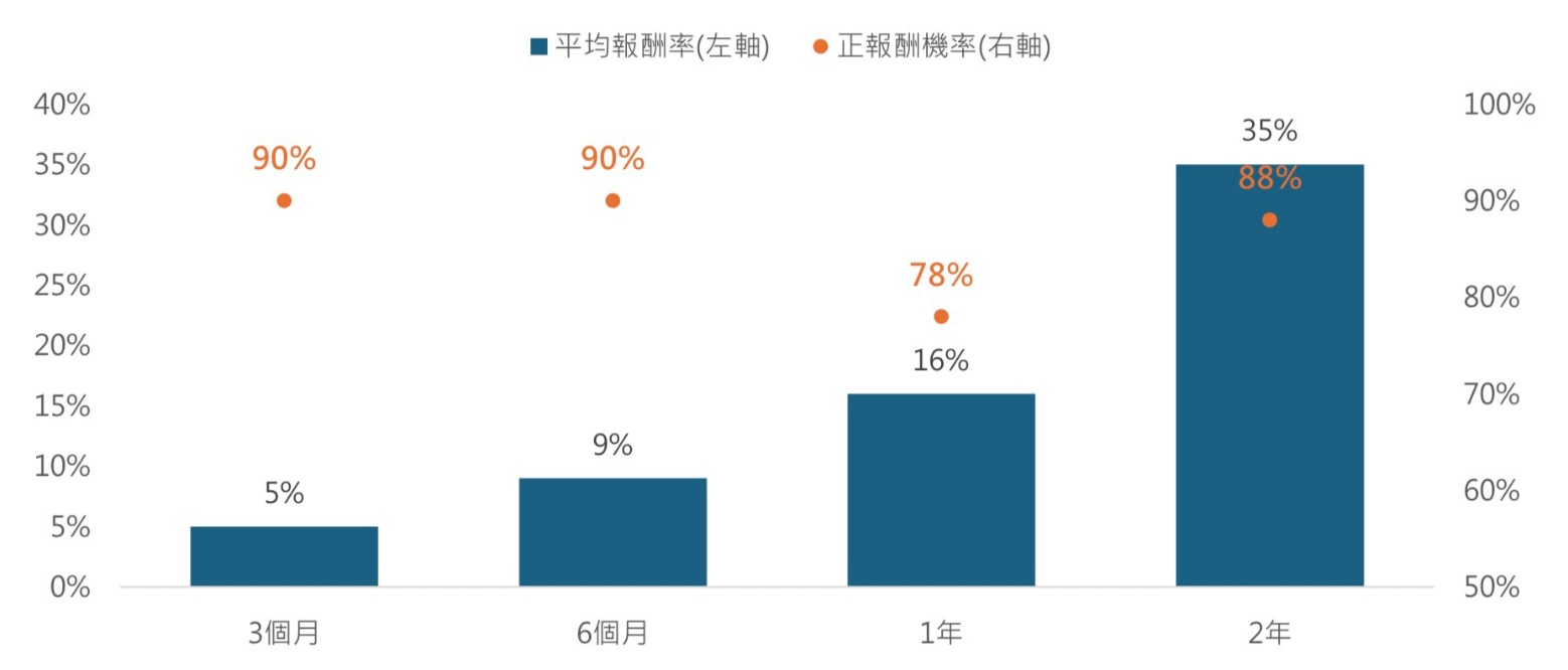 若進一步拉長持有期間,持有1年的平均報酬率為16%,勝率約78%,持有2年的平均報酬率35%,勝率88%,3月底進場不僅有望捕捉到第二季除權息旺季行情,更有機會透過長期持有參與台股長線成長趨勢。