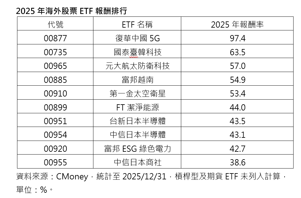 海外股票ETF來看,去年績效冠軍由復華中國5G(00877)拿下,2025年全年漲幅達97.4%,該ETF成分股聚焦中國A股AI基建及相關通訊類股。