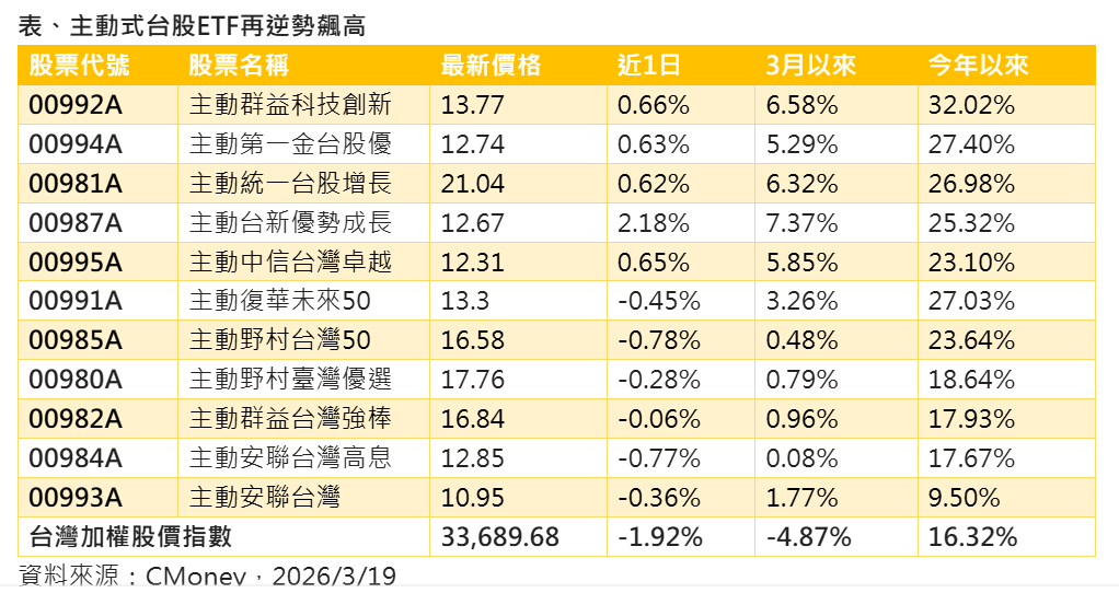 多檔主動式台股ETF也逆勢上漲,股價創新高且今年漲幅已超越25%的主動式台股ETF,包括主動群益科技創新(00992A)、主動第一金台股優(00994A)、主動統一台股增長(00981A),及主動台新優勢成長(00987A)。