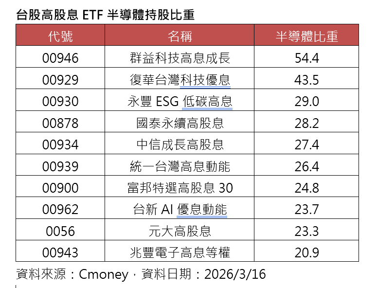 截至3/16,台股高股息ETF持有半導體類股比重最高前三名,分別為群益科技高息成長(00946)的54.4%、復華台灣科技優息(00929)的43.5%、永豐ESG低碳高息(00930)的29%,另外,國泰永續高股息(00878)、元大高股息(0056)、富邦特選高股息30(00900)、統一台股高息動能(00939)等規模逾百億標的持有比重也都有超過2成。