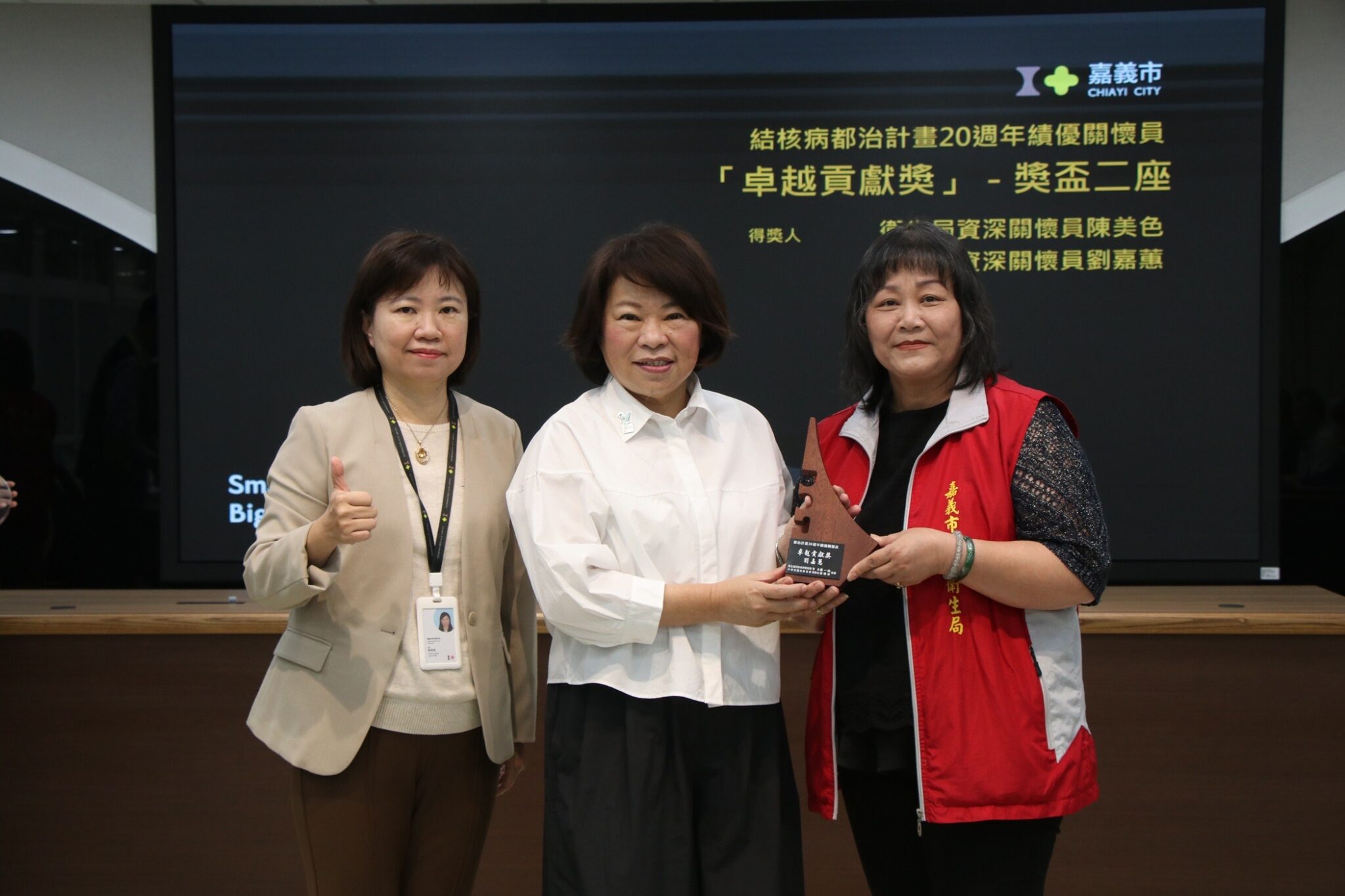 結核病防治邁向20週年,疾病管制署與中華民國防癆協會於9月24日首次舉辦都治關懷員表揚活動,本市共有兩位優秀專業人員獲得「卓越貢獻獎」,包括資深關懷員陳美色(服務20年)與劉嘉蕙(服務13年)。兩人多年來深度投入社區結核病患者追蹤、支持與衛教,陪伴無數家庭度過治療期,以高度專業與溫暖的服務成為城市不可或缺的默默力量。