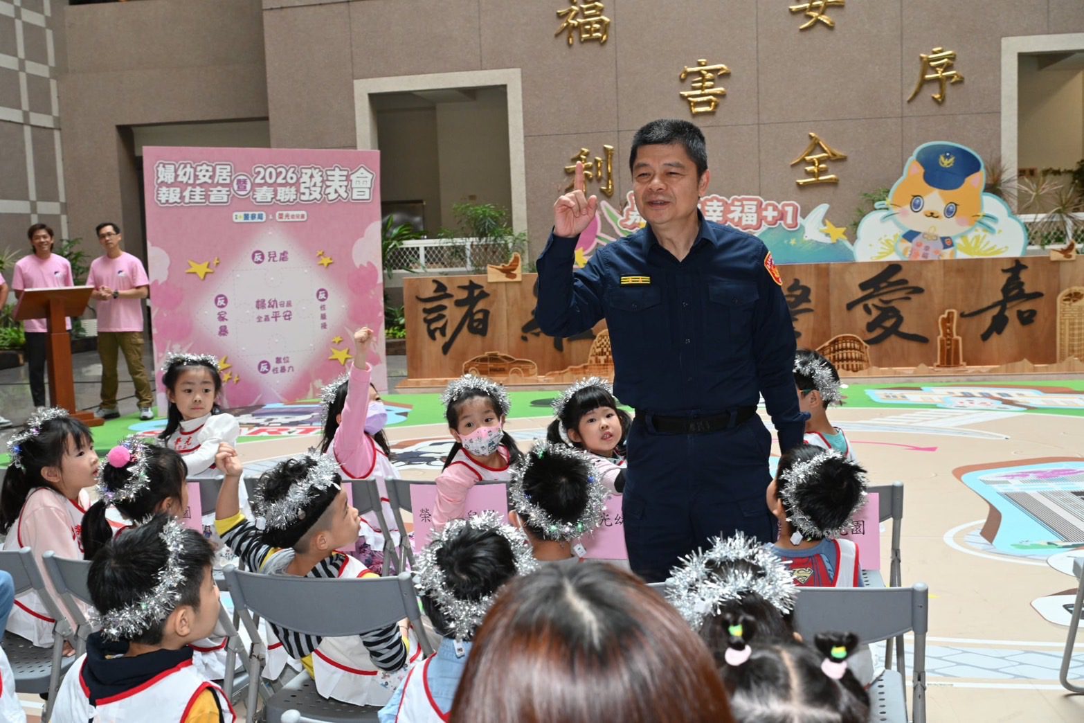 活動除透過榮光幼兒園孩子們純真的歌聲,傳遞平安與關愛外;警察局特別發表的2026「平安」春聯,正代表著嘉義市政府警察局整個團隊展望2026年的期許-警察守護嘉園、守護社區、守護婦幼、守護每一個家庭的用心與承諾,另外以可愛萌寵貓咪做為春聯主角,就是希望吸引小朋友的目光,讓孩子們更願意親近警察,認識警察。