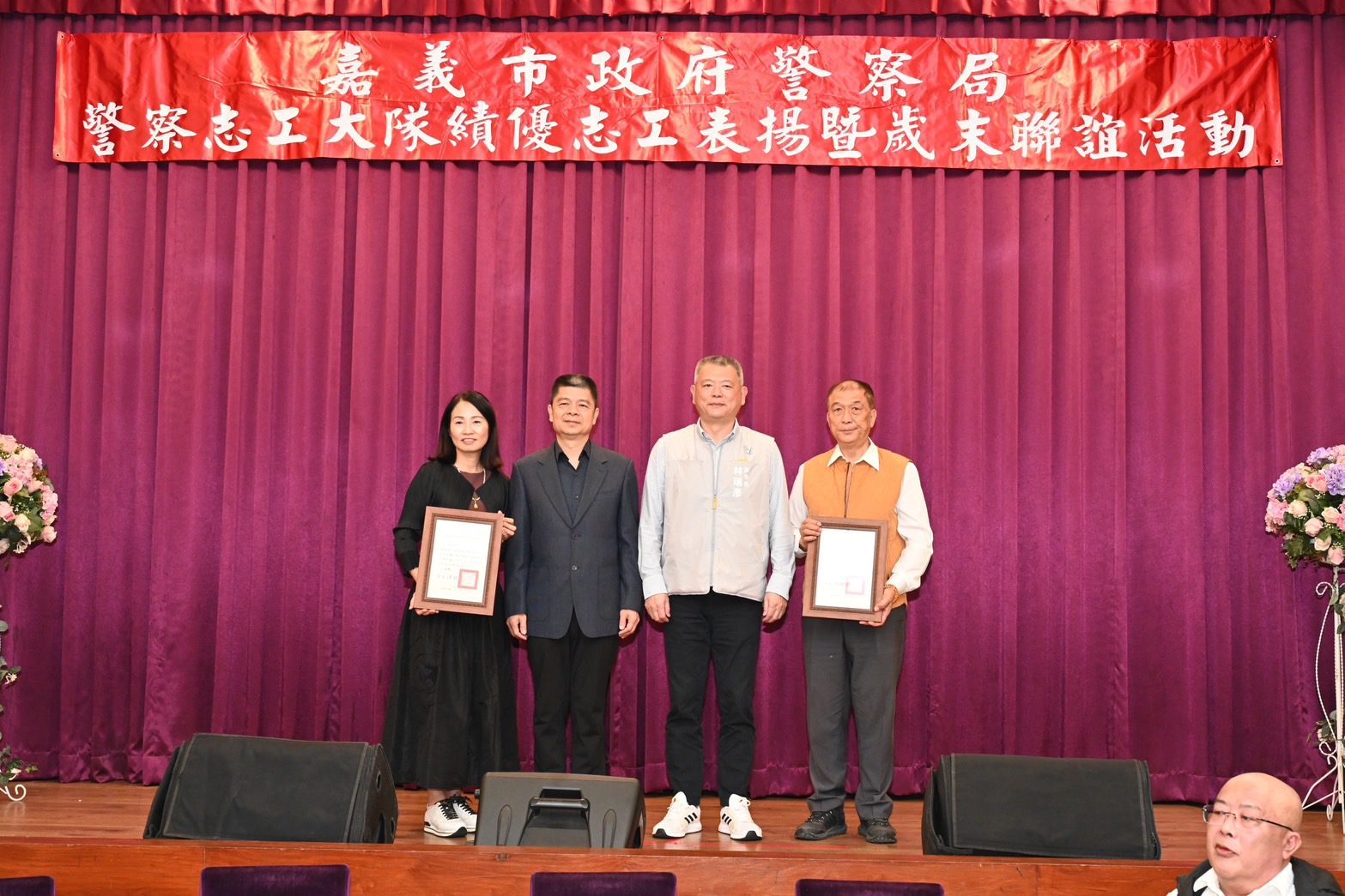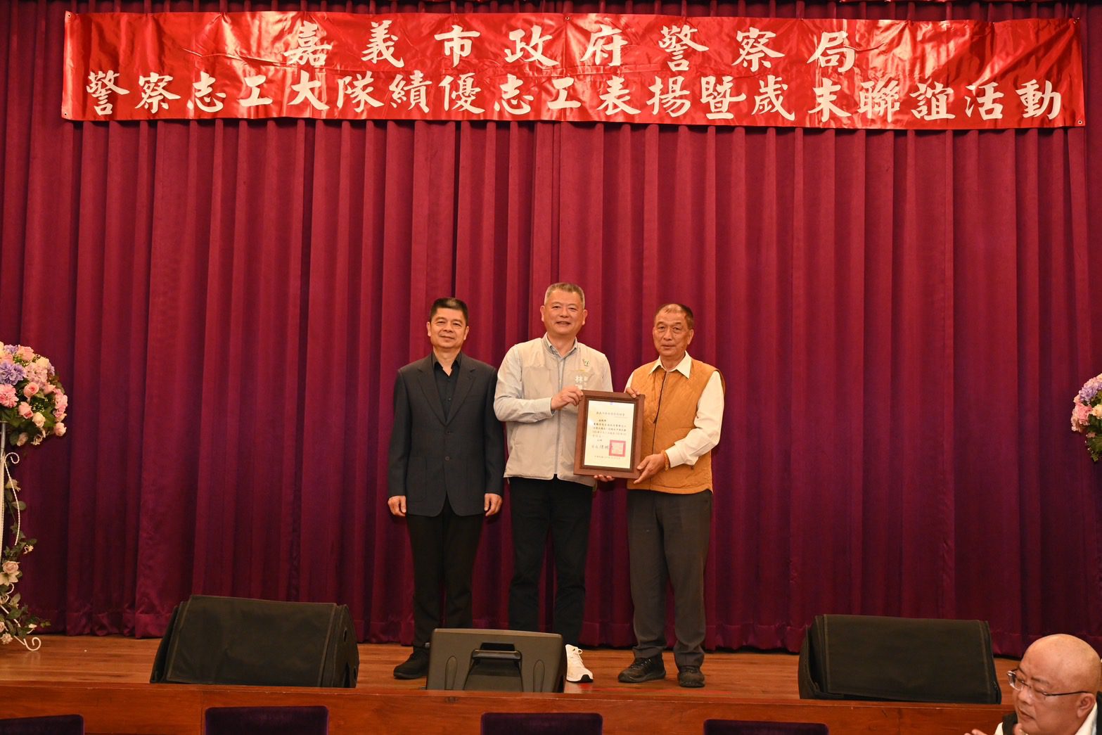 為了感謝及慰勞警政工作的堅強後盾,長期協助警察從事犯罪預防及交通宣導,警察局於12月9日假「鈺通大飯店」舉辦警察志工年終歲末感恩餐會暨大隊長、直屬中隊長續聘活動。 會中由副市長林瑞彥頒發115年志工大隊長黃國芳及直屬中隊長闕晨妍聘書,也表揚2位獲選衛生福利部114年度服務時數達3,000小時以上績優志工,及24位在本局服務連續滿10年以上與5位績優志工,現場共近300位志工暨嘉賓與會。 警察志工長年與警察如家人般緊密合作,成為維護治安與交通秩序的堅強後盾,尤其警察志工與警察同仁長期在派出所、各分局、公關科及少年隊服務,是警察局不可或缺的一份子,無論是服務報案民眾、協助反詐騙、防竊等犯罪預防及交通安全教育宣導等任務,處處可見黃背心活躍的身影,把志工的每一份付出,轉化為讓嘉義更安全、更貼心的力量,用行動為城市加一分溫度、加一分幸福、加一分守護,把愛心再往前推一步,再+1,一起打造「全齡共享、世代宜居」的永續城市。 市警局局長陳明志表示:「嘉義的好,不只是由警察守護,更是警察志工用愛心陪伴而成。今年我們以『志在嘉義,愛的守護再+1』作為精神象徵,希望讓所有市民知道,志工的力量正在悄悄讓城市變得更溫暖。」