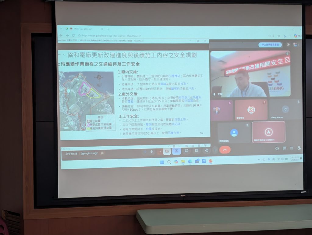 台電公司簡報協和電廠更新改建進度及後續施工規劃,說明拆除舊有機組、新建燃氣複循環機組與LNG接收站的安全設計,同時提出土壤污染整治、施工安全規劃、環境監測及消防安全設備防護等配套措施。