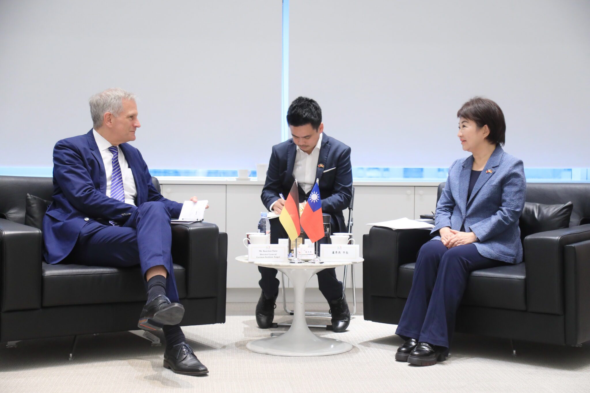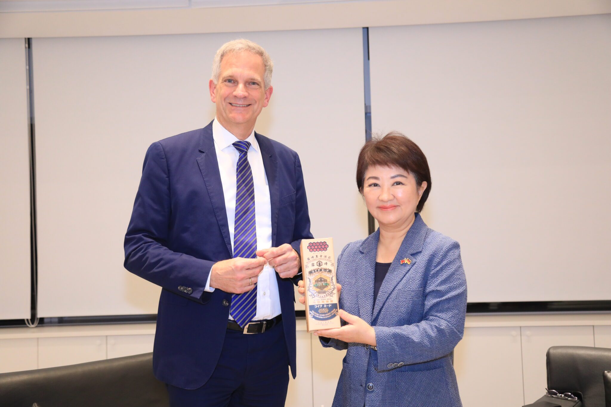 德國在台協會處長狄嘉信(Director General Karsten Tietz)於昨(25)日拜會台中市政府,由市長盧秀燕親自接待,並熱情招待風行全球的台中特產珍珠奶茶,雙方在輕鬆的氛圍中,針對兩地經貿、教育、政治、文化產業、全球政經情勢等議題熱絡交流,盧市長更強調,「德不孤,必有鄰」,台德雙方具有相同的價值觀與信念,期盼未來能與德國拓展更多面向合作與交流。