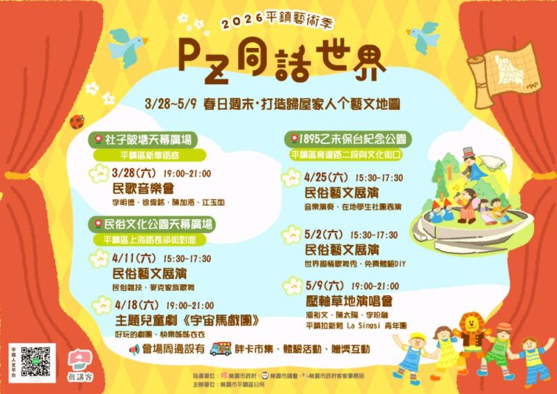 ▲桃園市2026「Pz 同話世界」平鎮藝術季自3月28日至5月9日共計六場藝文盛宴接續登場,邀請市民重新發現生活場域中的美好。(圖/桃園市平鎮區公所提供)