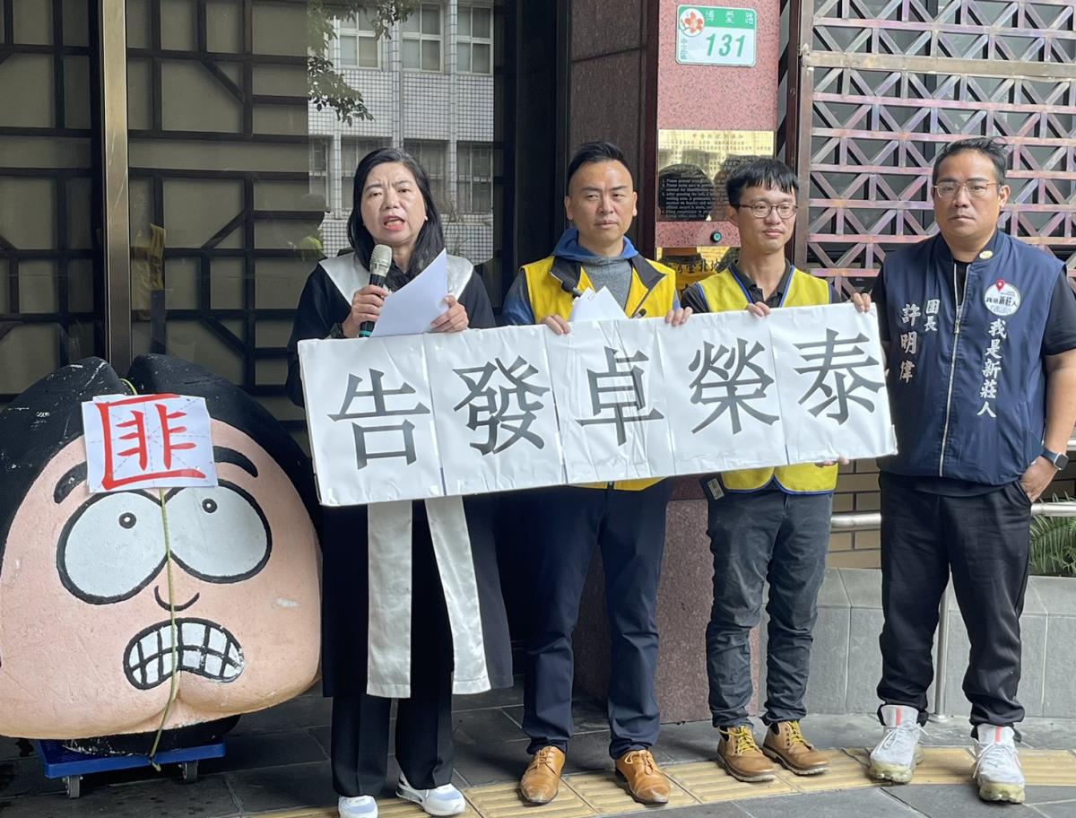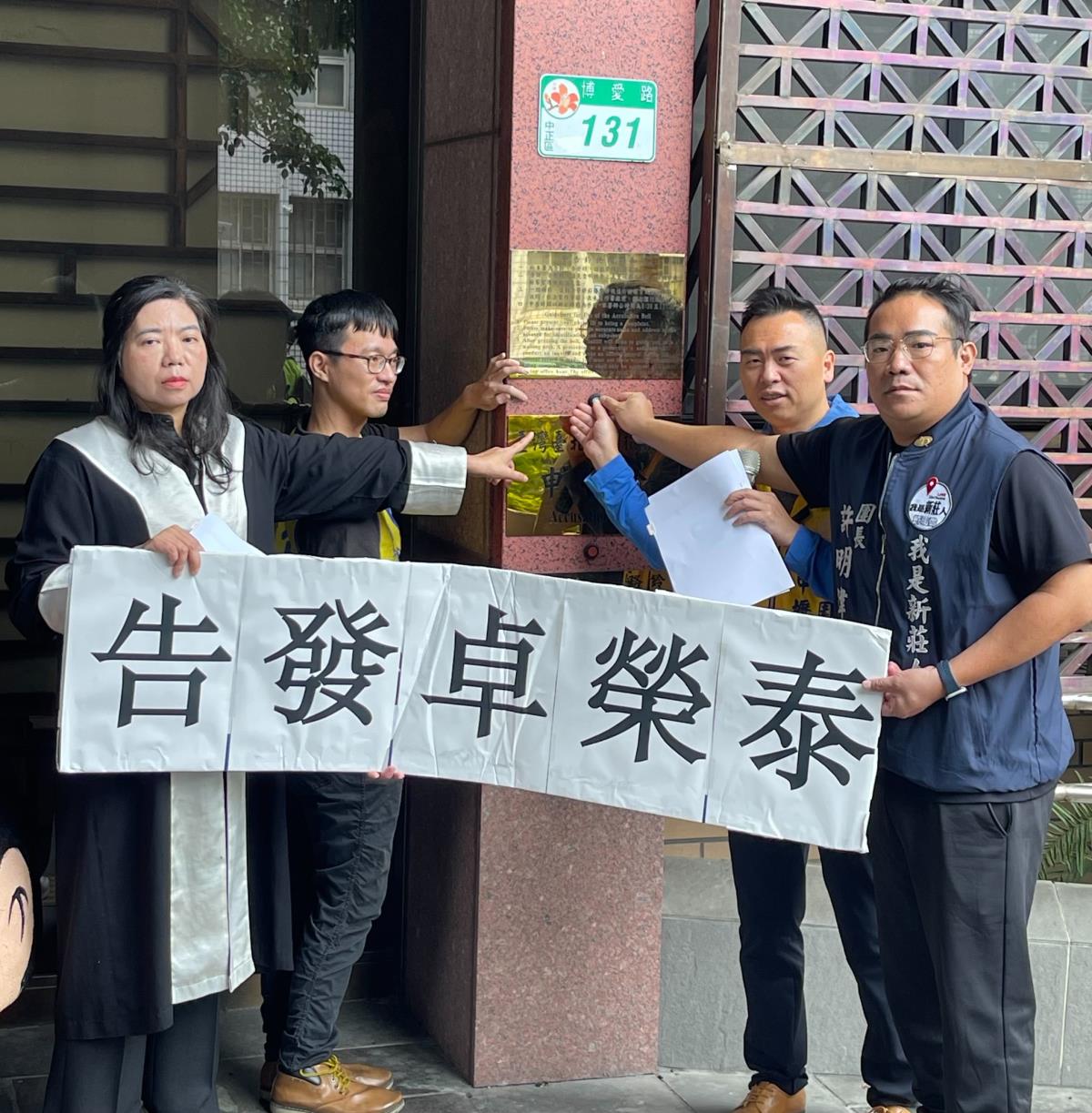 新黨副秘書長游智彬、發言人陳麗玲律師、青年軍許明偉於今(9)日上午赴台北地檢署,控告卓榮泰涉嫌違反《刑法》第129條「抑留剋扣罪」、瀆職罪等。