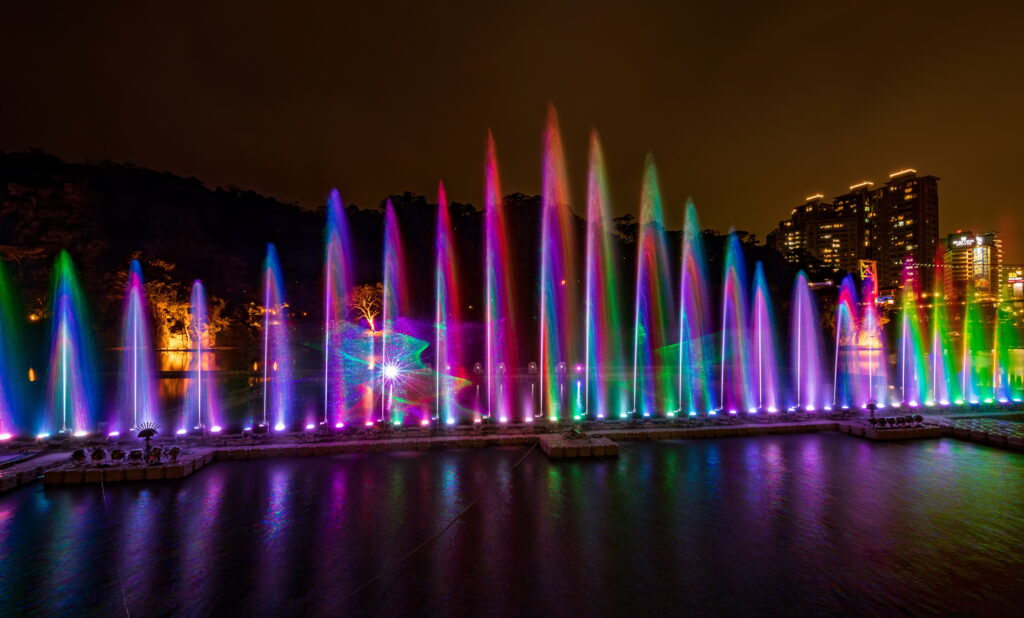 且今年首度導入LED發光地磚,隨著音樂節奏與水舞同步變化,營造如同戶外Disco般的動感氛圍;中央另設置六組LED光束燈,以直衝天際的光柱象徵「碧潭之心」,展現水岸城市的生命力與希望,成為夜間最具代表性的視覺焦點。