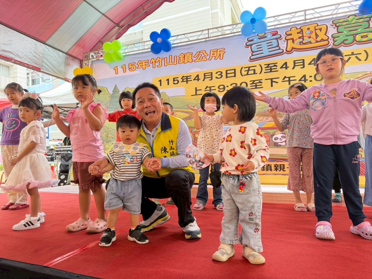 竹山鎮長陳東睦表示,為歡慶四月兒童月,公所規劃多場親子活動,「童趣嘉年華」讓孩子在遊戲中成長、也讓家長在陪伴中累積幸福回憶。鎮長並鼓勵家長可善用親子館資源,透過親子館多樣化的親職教育與共學活動,營造友善的育兒環境,讓每個家庭都能在陪伴與學習中,享受親子共同成長的幸福時光。