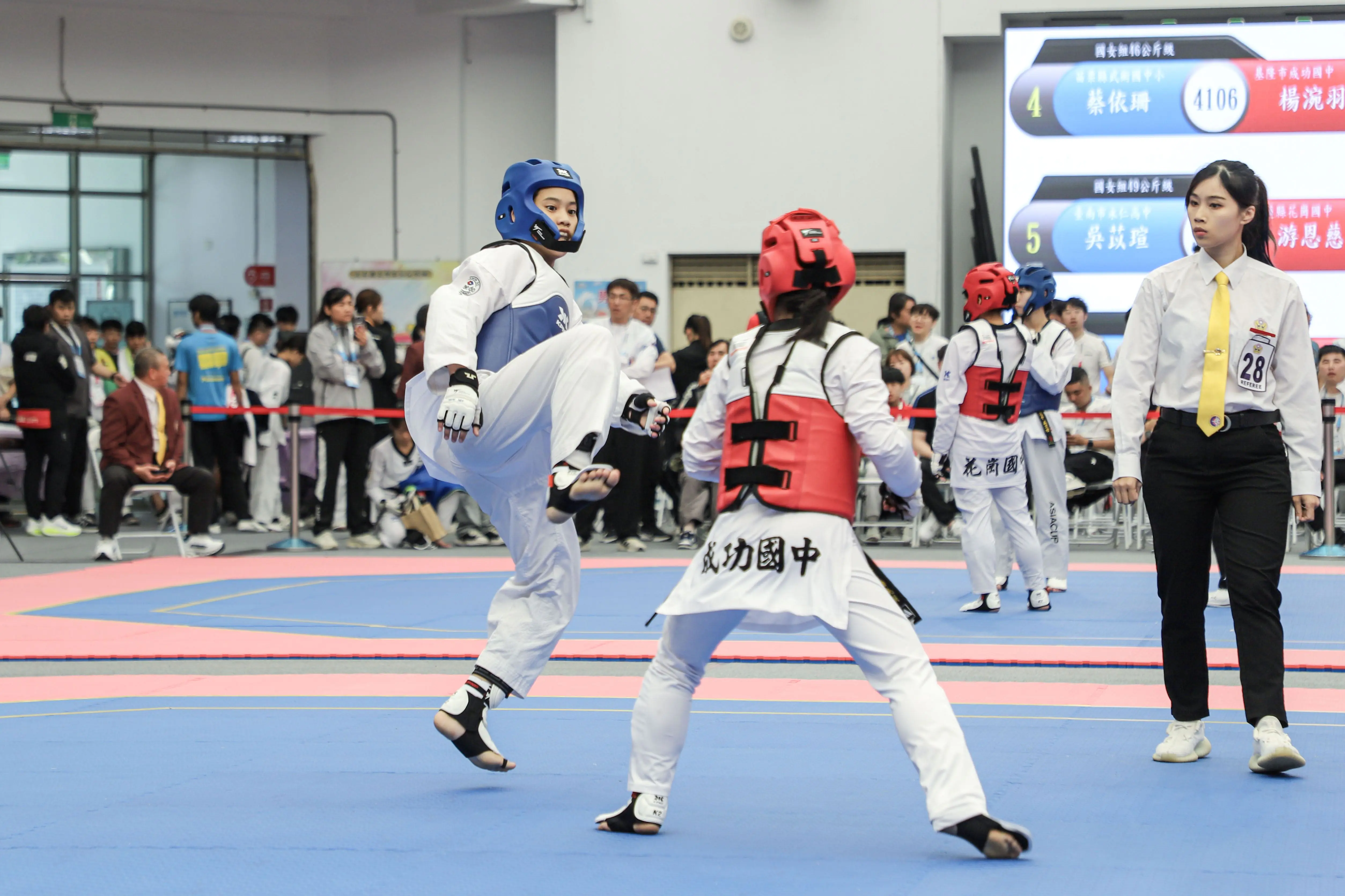 每日早上8點進行抽磅與過磅程序,9點比賽正式開始,對打項目採電子護具與電子計分系統,今日賽事中各縣市選手全力以赴,攻守轉換迅速,展現跆拳道對打的爆發力與競技張力,考驗選手反應、戰術判斷與技術運用能力。