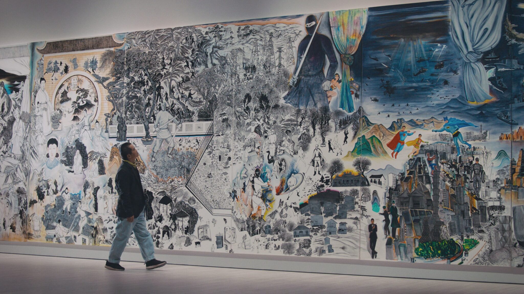 藝術家李明則解析〈走自己路的〉2017-2024 創作、以台語命名具有雙重意味「一個就是我畫畫的路、一個就是台灣自己走的路。」圖片提供 公視