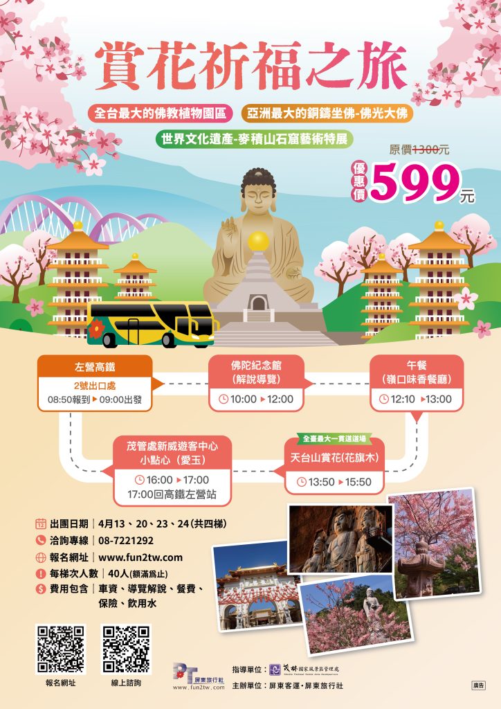 茂管處柯建興處長表示,本次推出「賞花祈福之旅」遊程,除了推廣六龜在地人文宗教特色以及結合在地產業,也歡迎順遊東高雄的美景一同進入六龜山城泡湯、賞花,體驗最 chill 的山城魅力。本次賞花祈福專車行程安排4梯次(4/13、20、23、24)每人599元,預計115年3月30日上午10點網路(https://www.fun2tw.com/TravelSchdule/Details/3306?Mobile=)開放報名,請欲體驗的遊客設定鬧鐘先搶先贏喔。