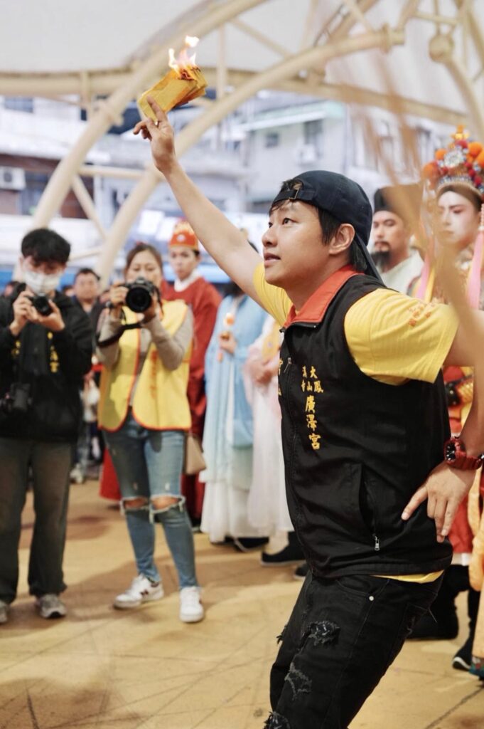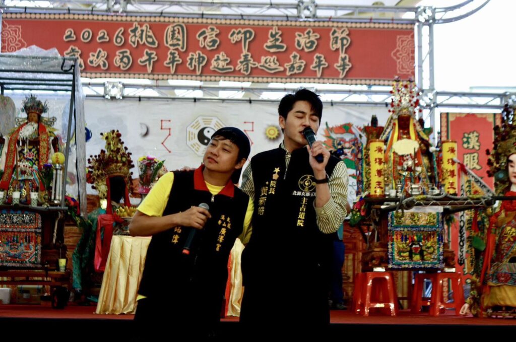 今年廣澤宮神遊春巡嘉年華活動非常多元,除了與也參與扮仙的草爺、柯大堡聯合舉辦「神行盃廣澤宮B-Max四驅車挑戰賽」,一起童心同行,4日一早就在八德藝文廣場展開兒童節天幕電影院《BIG》特映、小芙尼家族唱跳秀、鳳鳴齋國樂團、震樂堂等精彩表演,宮主賴銘偉也與震樂堂合唱〈為你來行〉,身為詞曲原創與主唱的他還與扮「田都元帥」的鄺澤東一起演唱〈萬年香火〉,並和「最帥乩童」好友黃新皓合唱〈中正路口分東西〉,讓現場民眾大飽耳福。