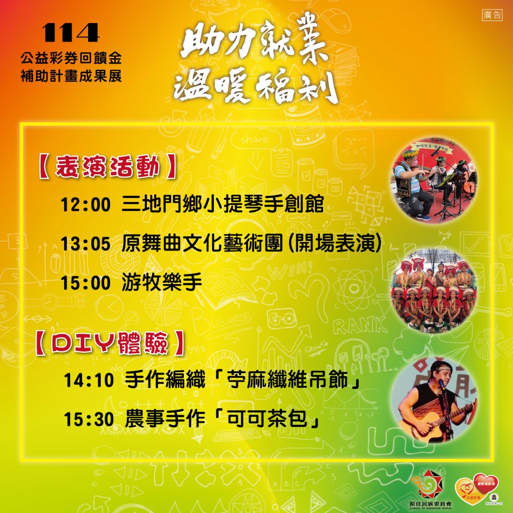 原住民族委員會於11月22日在臺中草悟道舉辦「助力就業 溫暖福利」114年公益彩券回饋金補助計畫成果展,現場熱鬧登場,集結成果特展、市集、手作體驗、樂舞展演與抽獎活動等豐富內容,展現推動原住民族就業與社會福利的具體成效。