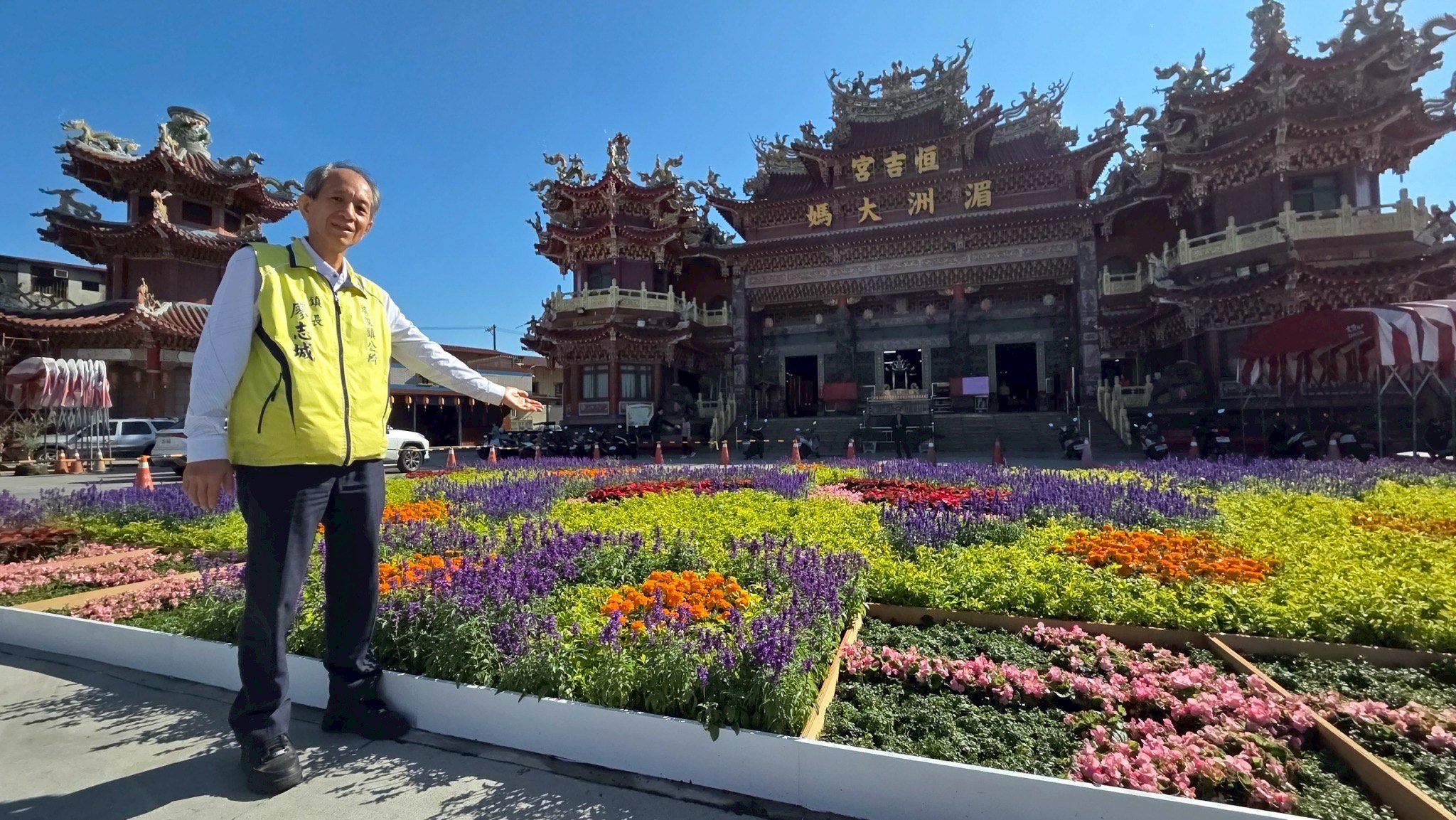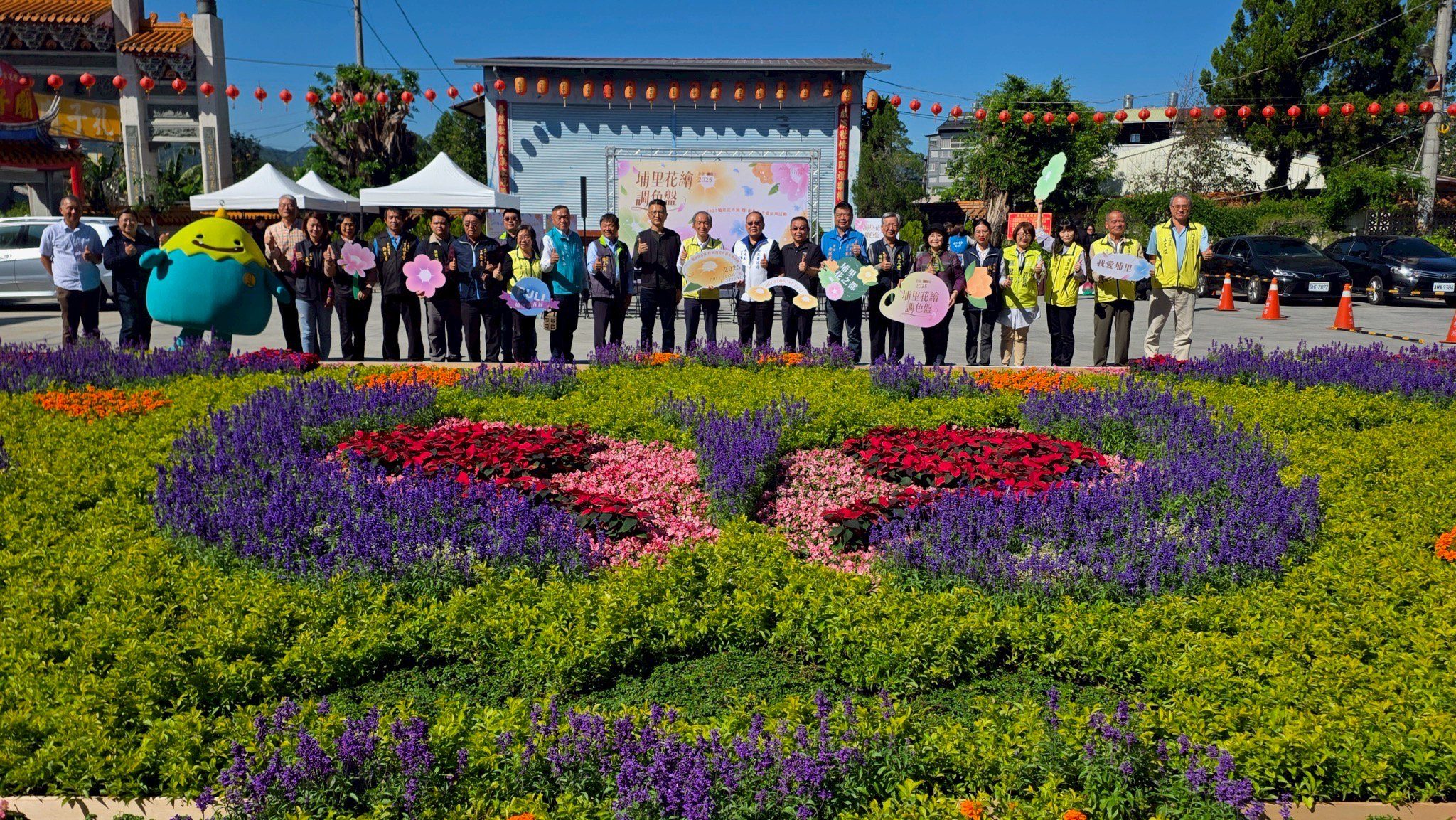 南投年度壓軸花卉盛會「2025埔里花卉展暨南投花卉嘉年華」,今(22日)於埔里信仰中心恒吉宮媽祖廟熱鬧開幕,廣場特別使用近2萬5000盆在地生產多樣花卉,結合埔里山水、蝴蝶及豐富農特產品等意象的大型色彩繽紛花毯,邀請民眾一起走進「花之都」,感受最美的山城風華。