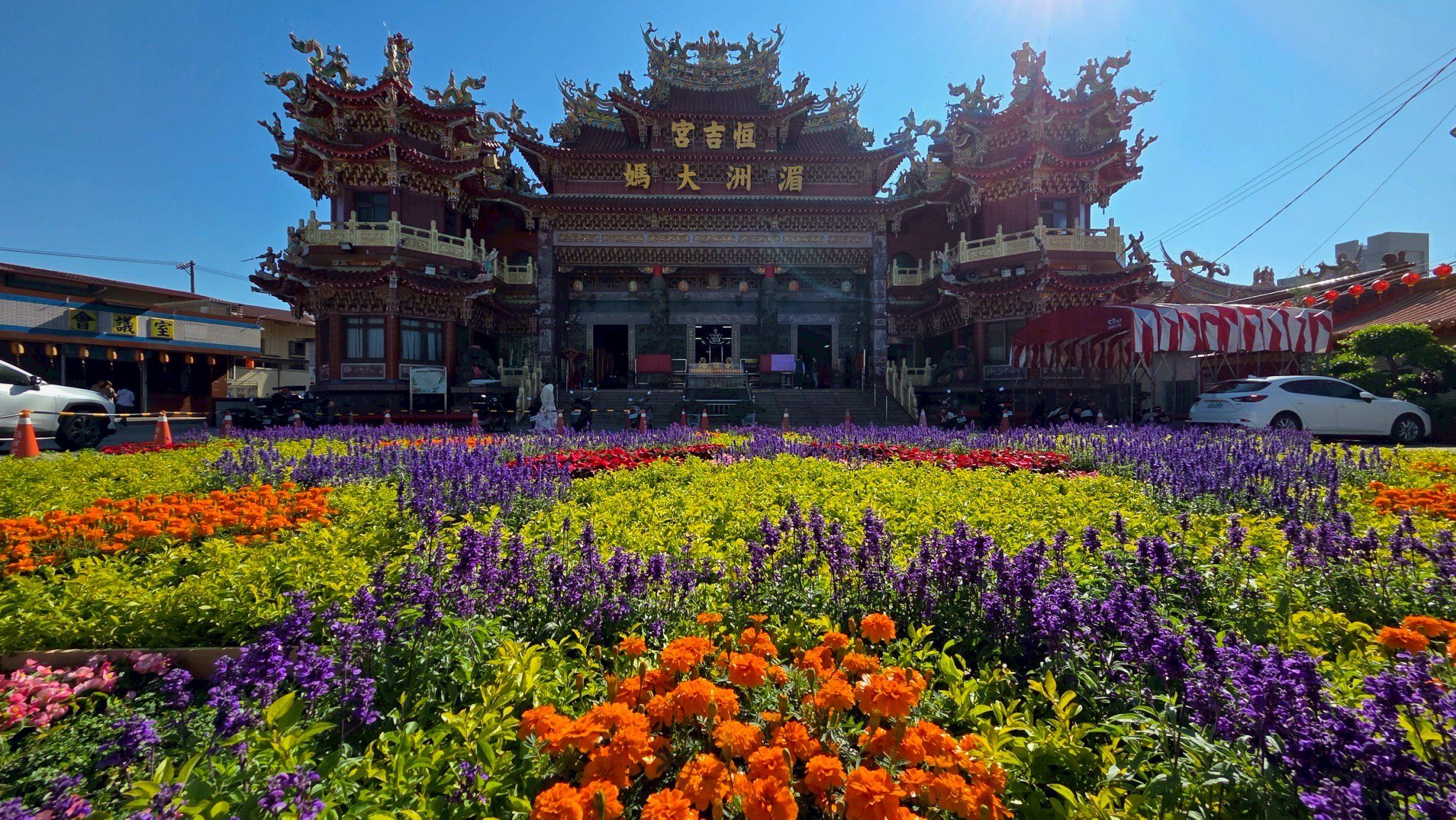 第二展場則在埔里信仰中心恒吉宮媽祖廟廣場,展出色彩繽紛的地景花毯作品,特別使用近2萬5000盆的多樣花卉,包括聖誕紅、萬壽菊、鼠尾草、斑葉綠草、蔓榕、甜菊薄荷等排列組合而成,透過空拍呈現埔里山水、蝴蝶、咖啡、百香果、香菇、花卉等造型,開幕前即吸引不少民眾搶先觀賞及拍照打卡。