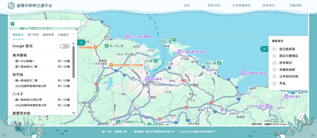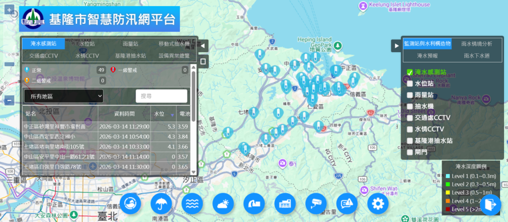 此外,基隆市有建置工務處「基隆市智慧防汛網平台」及交通處「基隆市即時交通平台」等重要系統。前者可以即時觀測「淹水感測站、水位站及雨量站」等多種水情訊息,提供災害應變決策的重要資訊;後者即時交通平台,整合「路況監視器CCTV、停車資訊及天氣」等訊息,提升城市交通管理效率與資訊透明度。