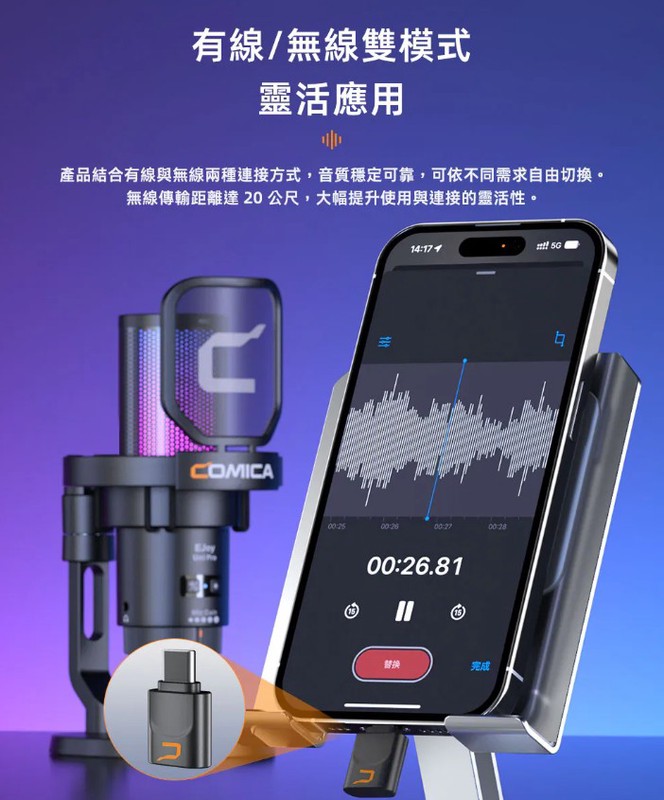 Ejoy Uni Pro USB電容式無線麥克風 — 行動創作新標準,USB 麥克風全面進化。延續 COMICA 的專業錄音品質,在 USB 麥克風基礎上加入無線功能,大幅提升收音距離與靈活度。支援 手機、平板、電腦 多平台使用,具備 錄音室等級音質、一鍵降噪與靜音、無級增益調節 等核心功能,是 直播、視訊會議、電競語音 的理想夥伴。另提供 懸臂支架版本,打造桌上型創作空間的最佳聲音中樞。