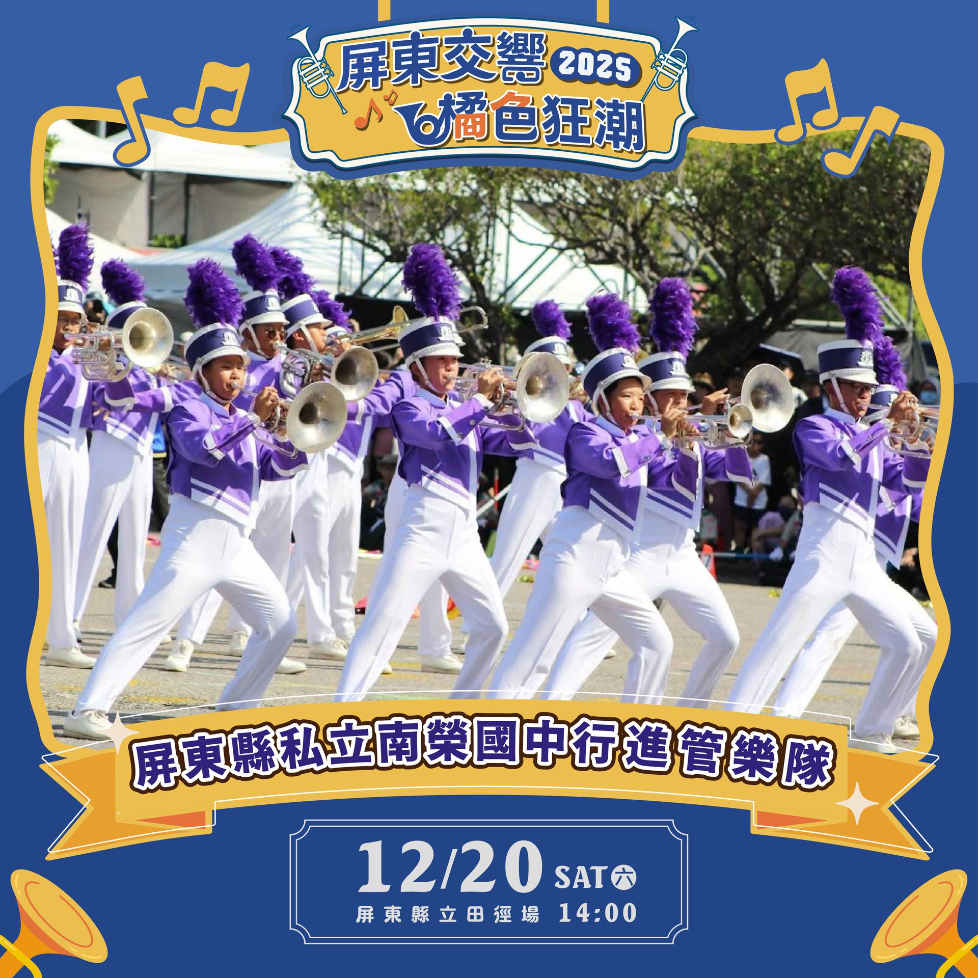 今年12月屏東將掀起一場前所未見的橘色旋風!享譽國際、被譽為「橘色惡魔」的日本京都橘高校吹奏樂部,即將於 12月20日(六)14:00來到屏東縣立田徑場,與屏東在地三校攜手帶來一場熱力四射的台日青春交流演出。活動免費入場,邀請民眾一同見證跨國音樂能量與友誼火花。 成立於 1961 年的京都橘高校吹奏樂部,以活力滿滿、笑容滿滿的表演風格聞名,其橘色制服更成為永不褪色的象徵。樂團至今已 20 度參加全日本行進管樂大賽,並於 2021 至 2025 年連續五年奪下金賞。除此之外,他們的足跡遍及影視作品及大型國際活動,今年1月更是第三度受邀至美國參加玫瑰花車大遊行,展現世界級的演出實力。 圖/屏東縣政府文化處提供 橘高校自2022 年受邀成為第一支登上國慶舞台的國外團體,引發全台矚目,接續多次來台,以精準完美的演出、陽光開朗的笑容,打動無數台灣觀眾。本次特別選擇南國屏東,與在地三所學校同台演出,學生們表示:「雖然語言不通,但心意能通,非常開心!」 屏東共演團隊也準備好大展身手,迎接國際級隊伍。屏東女子高級中學儀隊以槍法剛中帶柔、整齊劃一的步姿著稱,「紅色薔薇」象徵他們無畏挑戰的堅毅精神。南榮國中則是高屏地區唯一同時擁有室外行進樂團與室內管樂團的國中,行進管樂團(NZMB)多次在國際賽事中勇奪特優,更受邀赴海外演出。美和科技大學熊鷹儀隊由 60 名大學儲備軍官組成,以「熊鷹」象徵勇敢與韌性,將海軍陸戰隊槍法與活潑舞步結合,展現獨特的軍儀美學。 圖/屏東縣政府文化處提供 台日四隊將以音樂與肢體語彙交織出最熱血的篇章,12月20日屏東田徑場化為冬季最耀眼的舞台,邀請您一同感受熱血的青春之聲!另為服務行動不便的朋友,也提供復康巴士接送服務,每位身障朋友限1人陪同搭乘,如有需求請於 12 月13日前,洽各區預約專線訂車(屏北區 08-7386626、08-7372363;屏中區 08-7887433、08-8218947;屏南區 08-8892293 #403)。更多活動詳情,請關注屏東縣政府文化處官方臉書。 照片提供:屏東縣政府文化處