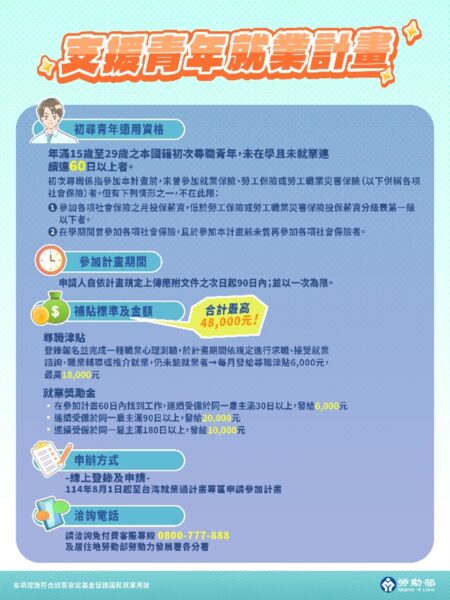 【焦點時報/記者羅蔚舟報導】勞動部為協助初入職場的青年因應國際情勢對就業市場所造成的影響,於今年9月推出「支援青年就業計畫」,凡年滿15至29歲本國籍未在學且連續60天未就業的初次尋職青年皆可參加,這項專案提供實體及線上職涯諮詢、履歷健診、求職媒合等服務,協助青年做好求職準備、穩健踏入職場;另外,透過3階段尋職津貼及就業獎勵金的機制,支持並鼓勵初次尋職的青年積極就業。「支援青年就業計畫」計畫啟動以來,桃竹苗地區已有1,239位青年成功領取補助。