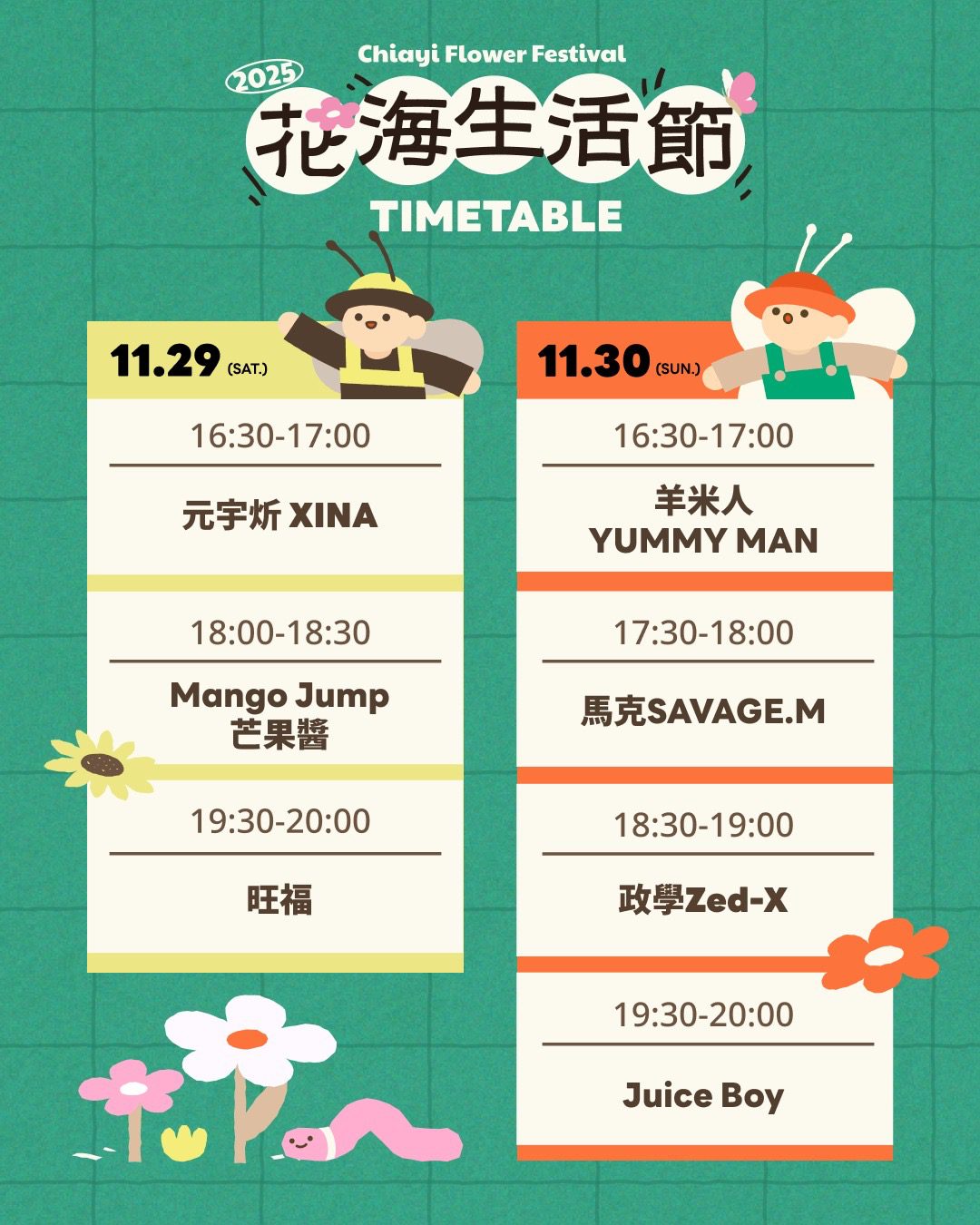 今年花海生活節的音樂陣容同樣亮眼,七組人氣卡司齊聚,包含Mango Jump芒果醬、旺福、元宇炘 XINA、羊米人 YUMMY MAN、馬克 SAVAGE.M、政學 Zed-X以及Juice Boy等輪番登場。多元風格一次集結,讓花海節成為11月底最具魅力、最值得期待的戶外音樂現場。