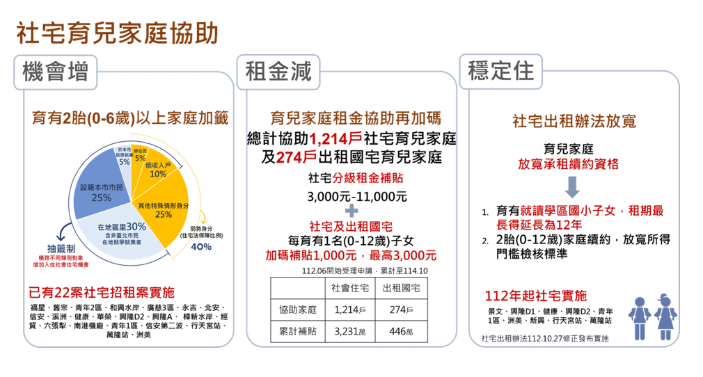 為協助新婚、育兒家庭降低居住負擔,都發局積極拓展公有出租住宅的多元供給,將都更分回、公益設施捐贈等取得的住宅資源納入「幸福住宅專案計畫」,鎖定新婚2年內或育有0至6歲子女的育兒家庭出租,114年已入住共156戶,115年預計可再釋出43戶。此外,針對社宅內的育兒家庭實施租金加碼補貼,自112年6月實施迄今,已幫助多達1,214戶家庭,展現了蔣市長打造友善育兒環境的決心。