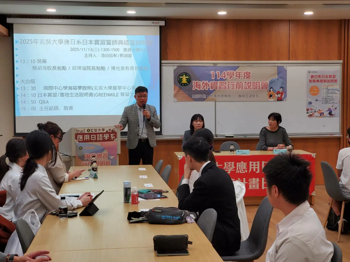 玄奘大學應日系 13 日舉辦「日本實習誓師典禮暨說明會」,學生與家長、師長齊聚一堂,在祝福中見證學生踏上國際職涯第一步。學生們帶著滿滿期待整裝出發,準備在日本展開跨文化學習旅程。