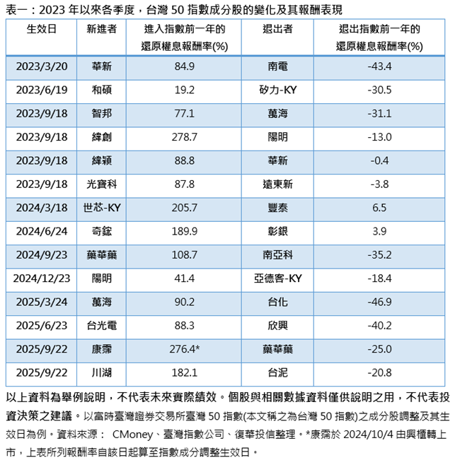 隨著產業洗牌、個股創新,台股市值前50大成分股不斷變動,例如2023年9月,緯創股價短短一年暴漲近三倍,風光晉身台灣50指數的新成分股,同期間曾經炙手可熱的萬海、陽明,卻因產業循環走下坡,一年之中的跌幅為一至三成,並退出台灣50成分股。由此可見台股新舊勢力不斷交替,市值前50大股票往往在進入前已增強,在退出前也已弱化(表一)。(個股與相關數據資料僅供說明之用,不代表投資決策之建議。)