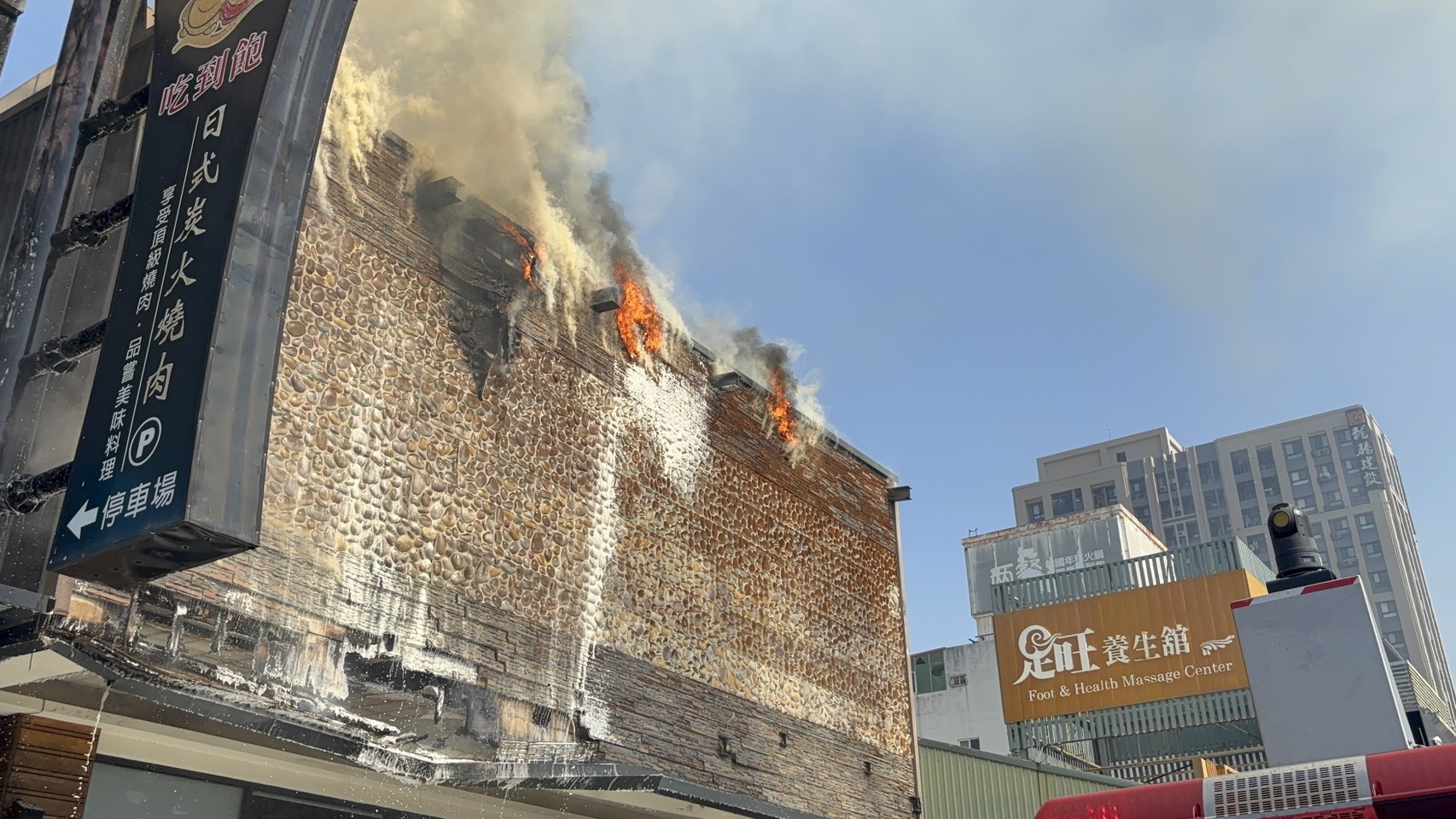 ▲台南石頭火鍋火警!疑裝潢釀災 外牆狂燒(圖/記者王俊勝 翻攝,下同) 這起意外發生在中午12點18分,一名路人看到店家外牆冒出濃煙,立刻報案。台南市消防局立即派遣安平等分隊,共計16輛消防車、35名消防人員前往搶救。抵達現場後,只見火鍋店外牆大型廣告看板猛烈燃燒,黑煙不斷往上竄,消防隊隨即拉水線壓制火勢。