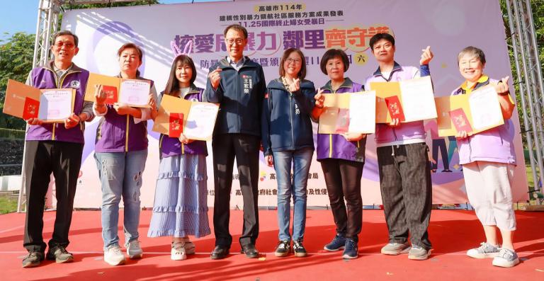 為響應「國際終止婦女受暴日」,社會局家防中心於今(22)日下午在衛武營都會公園夏日大道舉辦「114年度國際終止婦女受暴日宣導暨建構性別暴力領航社區服務方案成果發表活動」,以「擁愛反暴力,鄰里齊守護」為主題,串連跨局處網絡與社區力量,共同推動暴力防治與初級預防工作。活動以象徵性別平等與力量提升的紫絲帶意涵,由市府王宏榮副秘書長、社會局蔡宛芬局長、貴賓及社區夥伴共同傳遞紫絲帶,象徵凝聚公私協力的守護能量,一同承諾「拒絕暴力、從社區開始」啟動,共織屬於高雄的紫絲帶,並吸引超過800名親子與市民熱情參與,在輕鬆有趣的氛圍中認識家暴防治、兒少保護等重要觀念。
