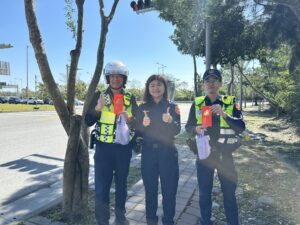 分局長賴楷淳於連假首日前往各交通崗位慰勤,致贈茶飲及紅包,為第一線執勤同仁加油打氣,感謝同仁堅守崗位、維護交通順暢,並叮囑大家注意保暖及自身安全,祝福同仁新年快樂、勤務平安順利。