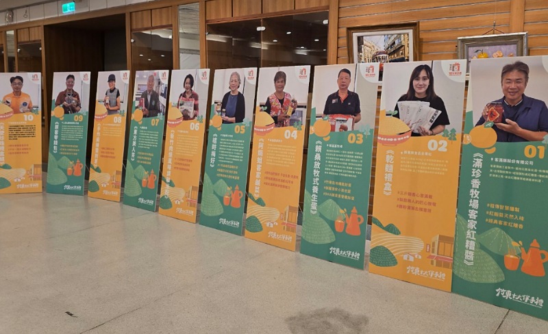 圖:竹東十大伴手禮徵選成果發表會暨記者會,會場擺放入選的十家業者的產品介紹立牌/竹東鎮公所提供