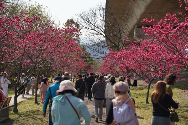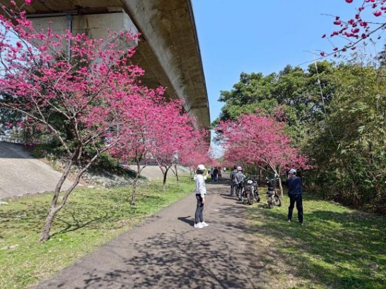 鎮長郭遠彰表示,竹東河濱公園內、沿著台68快速道路橋下的步道2.8公里兩側,種植了2000多株的櫻花,有山櫻、吉野櫻、八重櫻等多樣品種,每年2月陸續綻放,其中健行啟動儀式起走點,由133顆八重櫻組成的美麗花海健行大道最為吸睛,是浪漫台3線上知名的賞花打卡景點。