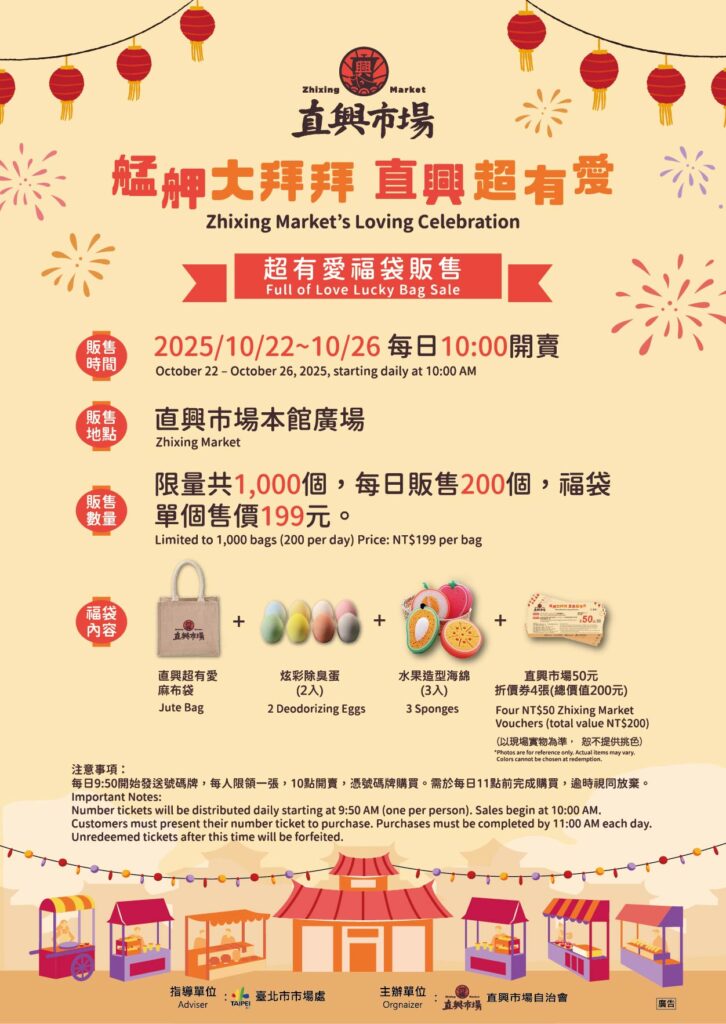 近年來直興市場都會為艋舺青山王祭活動提前暖身,每年都會販售專屬福袋,已經成為直興市場每年的固定活動,熟門熟路的老主顧,早在一個月前就在詢問細節,之前未參與到的新面孔,也有都不時地的在關注,想要一探直興福袋的神奇魅力。今年直興市場的「超有愛福袋」,以專屬設計的時尚麻布購物袋,內容物除了最受歡迎的200元直興市場折價券,還有水果造型海綿和炫彩除臭蛋,特別的是以糕點盒包裝像極了美味可口糕點,讓人好想咬一口。而福袋裡的每一件商品,都代表著直興市場滿滿的愛,回饋給支持及喜愛直興市場的消費者。活動自10月22日起至10月26日止,每日10點開賣,每日限量200個,售完為止,趕快把直興市場的「超有愛」帶回家吧!