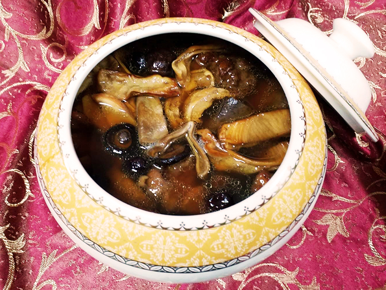 ▲共有諸事鴻圖五福臨、書閣鸞鳳煨魚翅、蒜味白肉海草蝦、港式奇珍龍虎班、培根粽情八寶飯、山中嫩筍轟層肉、田園窯烤龍鳳腿、霜醬德國脆魯足、罈香豬崽一窩樂、尊爵席悅仙草凍等10道菜色。