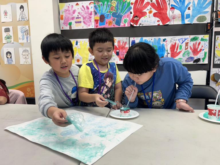 活動中,透過肥皂所產生的泡泡水,打造象徵海洋的畫面,再以繪圖人物、紙條海浪與創意拼貼,合力完成大型合作裝置,今天參與活動的蕙妤表示,她從來不知道肥皂泡泡除了可以洗手,還可以用來畫畫,在過程中不只獲得學習衛生觀念的體驗,也能自然地使用色彩與形象表達自己的想法,展現「我想說、我能說、我有能力說」的教育核心。